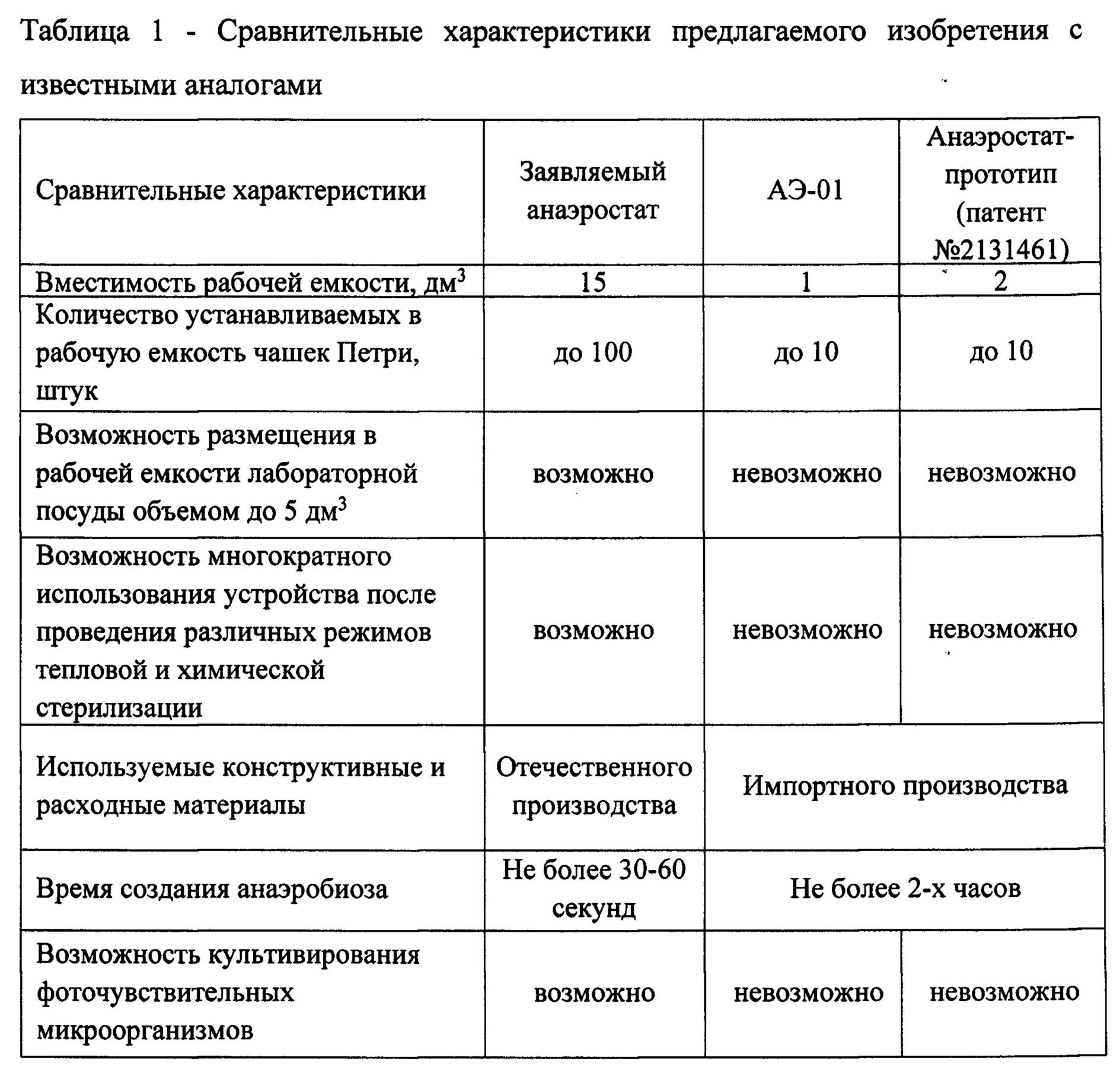 Создание необходимой для культивирования микроорганизмов газовой атмосферы в анаэростате обеспечивается с помощью подсоединенного через тройник газоподающего оборудования. В состав данного оборудования входят: баллоны (10) с необходимыми газами (аргон, углекислый газ и др.), газовые редукторы и манометры. Контроль подачи газов осуществляется при помощи манометров на газовом редукторе (9) (общее давление в баллоне) и манометра (7) на гибкой линии подачи газа (давление подаваемого газа). Подаваемый газ из баллонов проходит через противогазовые коробки ЕО-16(8) с целью его очистки от посторонних примесей. Сравнительные характеристики предлагаемого изобретения с известными аналогами представлены в таблице 1.