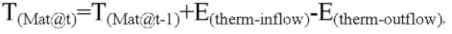 где T(Mat@t) - температура данного материала в заданный момент времени, T(Mat@t-1) - температура этого материала до этого заданного времени, E(therm-infiow) - тепловая энергия, достигающая упомянутого материала между t-1 и t, a E(therm-outflow) - тепловая энергия, покидающая материал между t-1 и t. Исходя из этого предположения, изменение температуры происходит не за счет изменения температуры самого материала, а за счет анализа и оптимизации потоков тепловой энергии, воздействующих на материалы.where T (Mat@t) is the temperature of the given material at a given time, T (Mat@t-1) is the temperature of this material before this given time, E( therm-infiow ) is the thermal energy reaching the said material between t-1 and t, a E (therm-outflow) is the thermal energy leaving the material between t-1 and t. Based on this assumption, the change in temperature occurs not due to a change in the temperature of the material itself, but due to the analysis and optimization of thermal energy flows acting on materials.