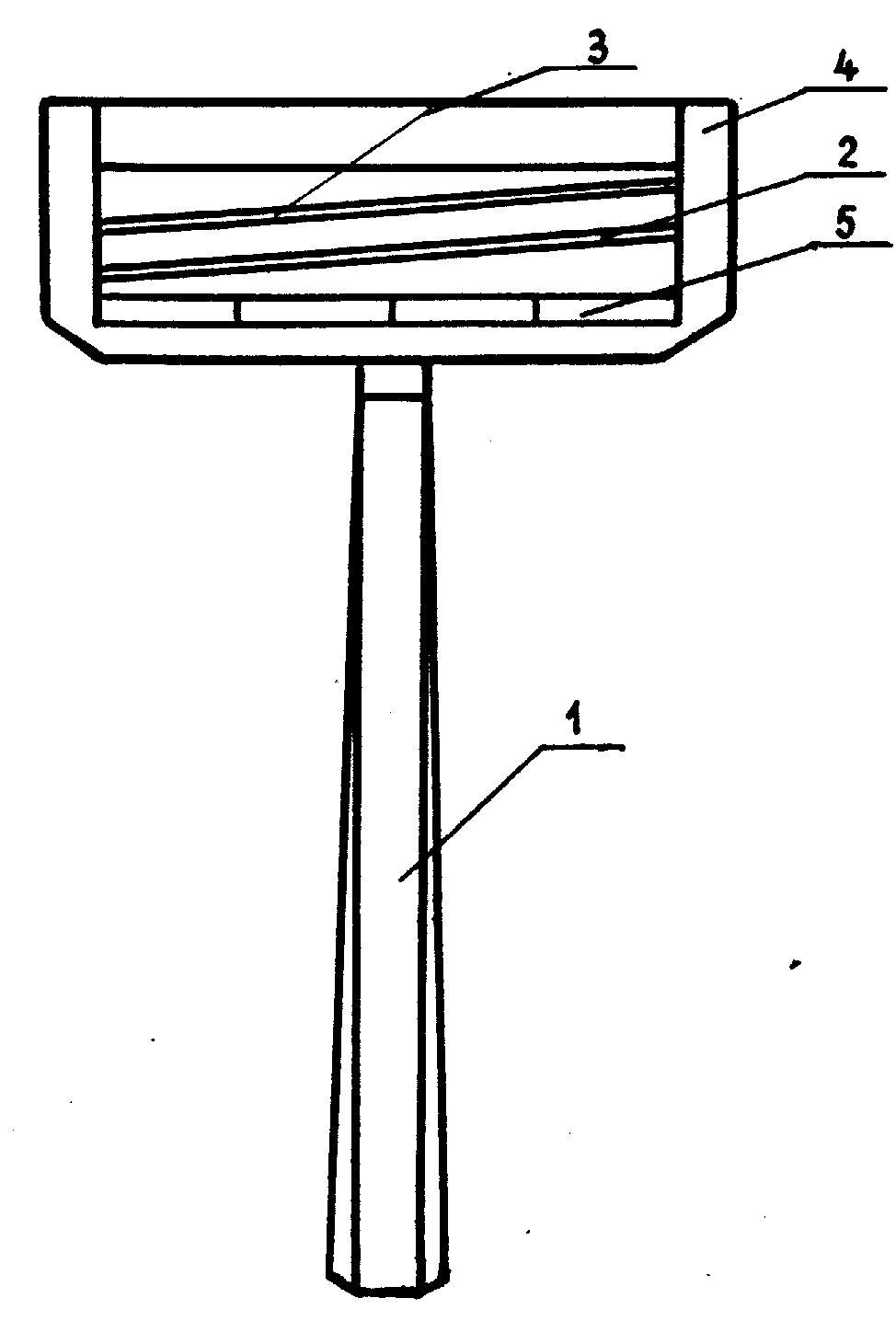 На фигуре 3- лезвиедержатель с раслоложенными в нем лезвиями. Конструкция бритвы рассматриватся на примере с двумя лезвиями. Безопасная бритва содержит ручку 1, лезвия 2 и 3, лезвиедержтель 4 предохранительный гребень 5. Пезвия 2 и 3 раслоложены под угпом 1,5 - 3 к горизонтальной оси лезвиедержателя 4. Угол наклона режущей кромки