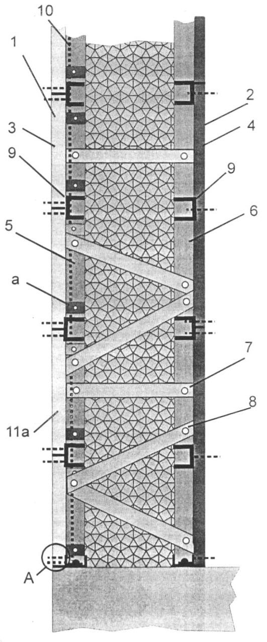 Наличие двухрядного металлического каркаса между наружной и внутренней стенками опалубки значительно повышает прочностные характеристики многослойной монолитной стены при технологической простоте изготовления. Кроме того, выполнение наружной стенки опалубки в виде фасадной отделки здания,