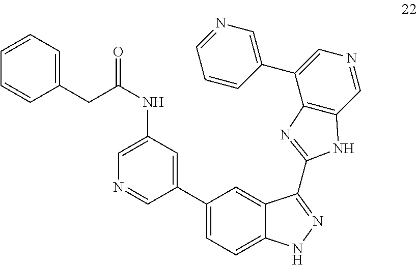- CVDWGLKUPXSZRR-UHFFFAOYSA-N CC(C)C(=O)NC1=CC(C2=CC=C3NN=C(C4=NC5=C(C=NC=C5C5=CC=CC=C5)N4)C3=C2)=CN=C1.CC(C)C(=O)NC1=CC(C2=CC=C3NN=C(C4=NC5=C(C=NC=C5C5=CC=CN=C5)N4)C3=C2)=CN=C1.CC(C)CC(=O)NC1=CN=CC(C2=CC=C3NN=C(C4=NC5=C(C=NC=C5C5=CN=CC=C5)N4)C3=C2)=C1.CCC(=O)NC1=CN=CC(C2=CC=C3NN=C(C4=NC5=C(C=NC=C5C5=CC=CC=C5)N4)C3=C2)=C1.O=C(NC1=CN=CC(C2=CC=C3NN=C(C4=NC5=C(C=NC=C5C5=CC=CN=C5)N4)C3=C2)=C1)C1CC1 Chemical compound CC(C)C(=O)NC1=CC(C2=CC=C3NN=C(C4=NC5=C(C=NC=C5C5=CC=CC=C5)N4)C3=C2)=CN=C1.CC(C)C(=O)NC1=CC(C2=CC=C3NN=C(C4=NC5=C(C=NC=C5C5=CC=CN=C5)N4)C3=C2)=CN=C1.CC(C)CC(=O)NC1=CN=CC(C2=CC=C3NN=C(C4=NC5=C(C=NC=C5C5=CN=CC=C5)N4)C3=C2)=C1.CCC(=O)NC1=CN=CC(C2=CC=C3NN=C(C4=NC5=C(C=NC=C5C5=CC=CC=C5)N4)C3=C2)=C1.O=C(NC1=CN=CC(C2=CC=C3NN=C(C4=NC5=C(C=NC=C5C5=CC=CN=C5)N4)C3=C2)=C1)C1CC1 CVDWGLKUPXSZRR-UHFFFAOYSA-N 0.000 description 1