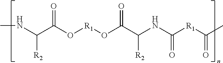Tetra-p-toluenesulfonic acid salts of bis (L-arginine), α, ω-alkylene diesters (monomers II) were prepared according to Yamanouchi, et al., Biomaterials 29:3269 (2008). The following is an example of a synthesis protocol for tetra-p-toluenesulfonic acid salt of bis (L-arginine) butane diesters. L-arginine (0.04 mol) and 1, 4-butanediol (0.02 mol) were directly mixed in a three neck round bottom flask with toluene (400 mL, b.p. 110° C.) with the presence of p-toluenesulfonic acid monohydrate (0.082 mol). The solid-liquid reaction mixture was heated to 130° C. and reflux with stirring for 24 hr with 2.16 mL (0.12 mol) of water generate. The reaction mixture (viscous solid) was then cooled to room temperature. Toluene was decanted. The resulting product was finally purified by dissolving the product in 2-propanol at 75° C. with stirring and then precipitating at 4° C. for three times. The ideal precipitation time is around 12 h. 2-propanol was changed each time after precipitating and decanted afterwards, and the white sticky mass was dried in vacuo. The final product was a white powder. Three monomers II were made: tetra-p-toluenesulfonic acid salt of bis (L-arginine) ethane diesters, Arg-2-S, (y=2); tetra-p-toluenesulfonic acid salt of bis (L-arginine) propane diesters, Arg-3-S (y=3); tetra-p-toluenesulfonic acid salt of bis (L-arginine) butane diesters, Arg-4-S (y=4); S indicates that the Arg diester monomer is in the p-toluenesulfonic acid salt form. The monomers are a white solid powder. The chemical structures of all the monomers I and II were confirmed by 'HNMR.