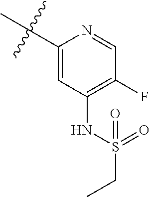 The kinase reaction was conducted in polystyrene 384-well Greiner Bio-one white plate from Thermo Fisher Scientific in a final volume of 25 μL. Inhibitors were first diluted serially in DMSO and added to the plate wells before the addition of other reaction components. The final concentration of DMSO in the assay was 2%. The PI3Kγ assay was carried out at room temperature in 20 mM MOPS, pH 6.7, 10 mM MgCl2, 5 mM DTT and CHAPS 0.03%. Reactions were initiated by the addition of ATP, the final reaction mixture consisted of 20 μM PIP2, 2 μM ATP, 0.5 μCi [γ-33P] ATP, 13 nM PI3Kγ. Reactions were incubated for 120 min and terminated by the addition of 40 μL SPA beads suspended in quench buffer: 163 mM potassium phosphate pH 7.8, 20% glycerol, 25 mM EDTA. The final concentration of SPA beads is 1.0 mg/mL. After the plate sealing, plates were shaken overnight at room temperature and centrifuged at 1500 rpm for 10 min, the radioactivity of the product was determined by scintillation counting on Topcount (Perkin-Elmer). IC50 determination was performed by fitting the curve of percent of the solvent control activity versus the log of the inhibitor concentration using the GraphPad Prism 6.0 software. Data for the Examples, obtained using the methods described in Example B, are provided in Table B.