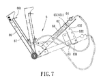 - the adjusting unit 6 includes a pivot seat 61 which is disposed on the rear rod section 322 , an adjusting tube 62 which has a pivot end pivotably connected to the pivot seat 61 so as to permit the adjusting tube 62 to be turned relative to the pivot seat 61 between an upper limit position and a lower limit position, a retaining seat 63 which is disposed on the front rod section 321 , a movable member 64 which is disposed in and movable along the adjusting tube 62 , a retained pin 65 which is disposed on the movable member 64 to be moved to be retained to the retaining seat 63 , an adjusting handle 66 which has a pivot end pivotably connected to the pivot seat 61 about an axis coaxial with that of the adjusting tube 62 and connected with the adjusting tube 62 , and an operated end operable manually to turn the adjusting tube 62 , a releasing cable 67 which has an end connected to the movable member 64 and an opposite end disposed