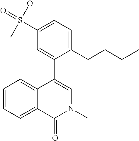 - FFHSTKMZHGJMDB-UHFFFAOYSA-N CCCOC1=CC=C(S(C)(=O)=O)C=C1C1=CN(C)C(=O)C2=C1C=C(N1C=C(F)C=N1)C=C2 Chemical compound CCCOC1=CC=C(S(C)(=O)=O)C=C1C1=CN(C)C(=O)C2=C1C=C(N1C=C(F)C=N1)C=C2 FFHSTKMZHGJMDB-UHFFFAOYSA-N 0.000 description 3