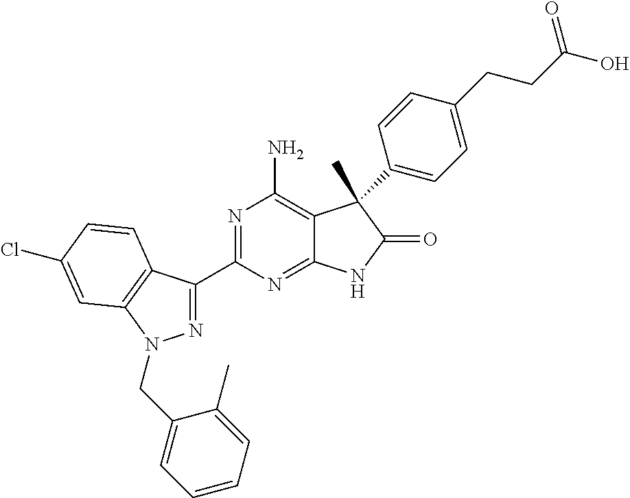 Compound or vehicle was administered intra-tracheally under light isoflurane anesthesia (5% in oxygen; flow rate 2.0 L/min for 3 minutes). Once anesthetized, rats were placed on an angled intubation stand in supine position and the trachea visualized using a small laryngoscope. Animals then received either 0.5 mL/kg of vehicle or 0.5 mL/kg vehicle containing compound intra-tracheally delivered via microsprayer by use of a Penn-Century Microsprayer® needle 3″ (Model IA-1B-GP) attached to a 1 mL high pressure syringe (Penn Century-Model B-SYR-PL1000) (Penn-Century, Philadelphia, Pa.). The Microsprayer® tip was inserted into the trachea up to the point at which the bend in the needle is close to the tip of the snout, which positions the tip of the Microsprayer® in front of the carina (bifurcation of trachea at the bronchi). After dose delivery the animal is placed on its back in the home cage for recovery.