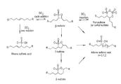 FIG. 1A illustrates the reactions of an internal olefin with sulfur trioxide (sulfonating agent) during a sulfonation process.