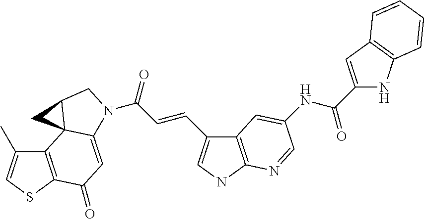 - DKHKILMWOTZNRZ-OVKVCFKUSA-N n-[3-[(e)-3-[(8s)-8-(chloromethyl)-4-hydroxy-1-methyl-7,8-dihydrothieno[3,2-e]indol-6-yl]-3-oxoprop-1-enyl]-1h-pyrrolo[2,3-b]pyridin-5-yl]-1h-indole-2-carboxamide Chemical compound C1=CC=C2NC(C(=O)NC3=CN=C4NC=C(C4=C3)/C=C/C(=O)N3C4=CC(O)=C5SC=C(C5=C4[C@H](CCl)C3)C)=CC2=C1 DKHKILMWOTZNRZ-OVKVCFKUSA-N 0.000 claims description 2
