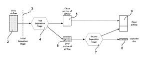 At the start of the flow diagram, a volume of air is provided which contains dirt particles: the dirty airflow 2. The dirty airflow 2 is illustrative of a volume of air being drawn into the separator. The dirty airflow 2 first passes through an Initial Separation Stage 3. The purpose of the initial separation stage 3 is to remove relatively large particles of dirt and debris from the airflow that could block or clog up later separation stages that are configured to remove smaller particles of dirt. The initial separation stage 3 may be, for example, one or a combination of a simple mesh filter or a low efficiency cyclone chamber 40 or shroud.