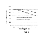 FIG. 6 The capacity retention of 2 lithium-ion cells (one with an inventive solid state electrolyte and the other with a PEO-based solid polymer electrolyte) plotted as a function of discharge C rates.