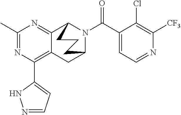 - VCVAMSJVHFXALX-YVEFUNNKSA-N ClC1=C(C=CC=C1C(F)(F)F)C(=O)N1[C@@H]2CC3=C(N=C(N=C3C3=CC=NN3)C)[C@H]1CCC2 Chemical compound ClC1=C(C=CC=C1C(F)(F)F)C(=O)N1[C@@H]2CC3=C(N=C(N=C3C3=CC=NN3)C)[C@H]1CCC2 VCVAMSJVHFXALX-YVEFUNNKSA-N 0.000 claims description 5