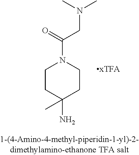 Assays were performed in 96-well plates in a total assay volume of 100 μL. The final concentration of elastase enzyme (human leukocyte elastase, Sigma E8140) was 0.00072 U/mL. The peptide substrate (MeOSuc-Ala-Ala-Pro-Val-AMC, Calbiochem #324740) was used at a final concentration of 100 μM. The final concentration of DMSO was 1% in the assay buffer (0.05M Tris.HCl, 0.1M NaCl, 0.1M CaCl2, 0.0005% brij-35, pH 7.5). The enzymatic reaction was started by addition of the enzyme and incubated at 25° C. for 30 minutes. After incubation, the reaction was stopped by addition of soybean trypsin inhibitor (Sigma T9003) at a final concentration of 50 μg/well. Fluorescence was measured using a Molecular Devices fluorescence plate reader using 380 nm excitation and 460 nm emission wavelengths.
