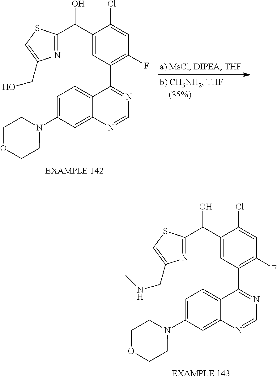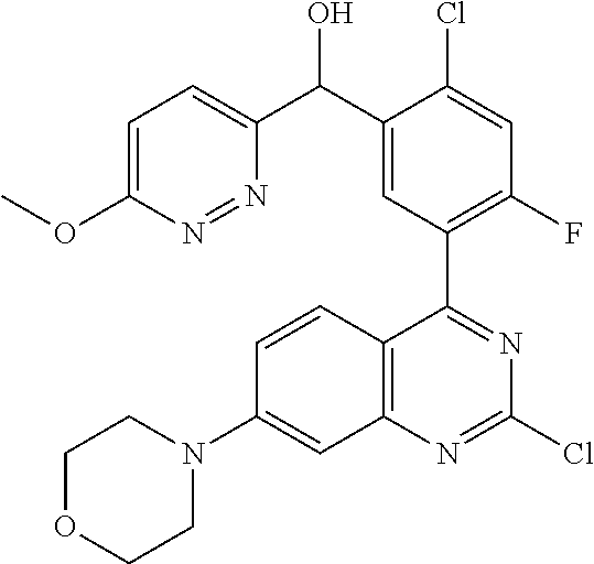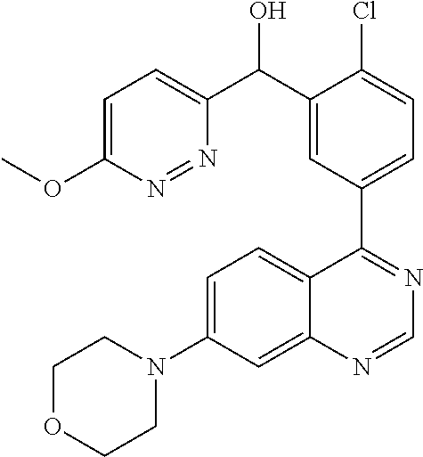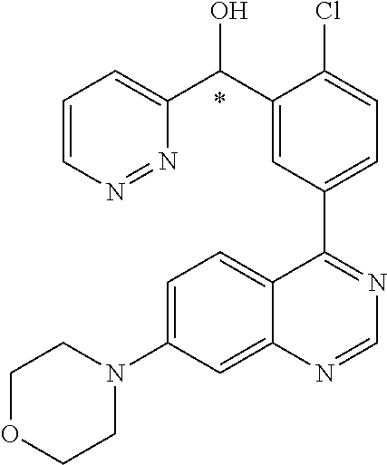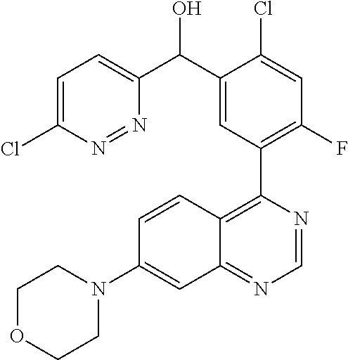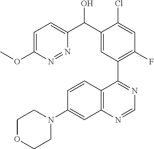 - MOWXJLUYGFNTAL-DEOSSOPVSA-N (s)-[2-chloro-4-fluoro-5-(7-morpholin-4-ylquinazolin-4-yl)phenyl]-(6-methoxypyridazin-3-yl)methanol Chemical compound N1=NC(OC)=CC=C1[C@@H](O)C1=CC(C=2C3=CC=C(C=C3N=CN=2)N2CCOCC2)=C(F)C=C1Cl MOWXJLUYGFNTAL-DEOSSOPVSA-N 0.000 claims description 3