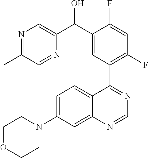 - KEMOASSFPWYYBE-UHFFFAOYSA-N [2,4-difluoro-5-(7-morpholin-4-ylquinazolin-4-yl)phenyl]-(3-methylpyrazin-2-yl)methanol Chemical compound CC1=NC=CN=C1C(O)C1=CC(C=2C3=CC=C(C=C3N=CN=2)N2CCOCC2)=C(F)C=C1F KEMOASSFPWYYBE-UHFFFAOYSA-N 0.000 claims description 6