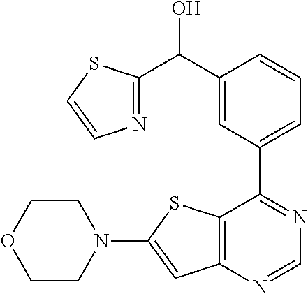 - JVZGLRHIUDPKQN-UHFFFAOYSA-N [4-fluoro-3-(6-morpholin-4-ylthieno[3,2-d]pyrimidin-4-yl)phenyl]-(3-methylpyrazin-2-yl)methanol Chemical compound Cc1nccnc1C(O)c1ccc(F)c(c1)-c1ncnc2cc(sc12)N1CCOCC1 JVZGLRHIUDPKQN-UHFFFAOYSA-N 0.000 claims description 5