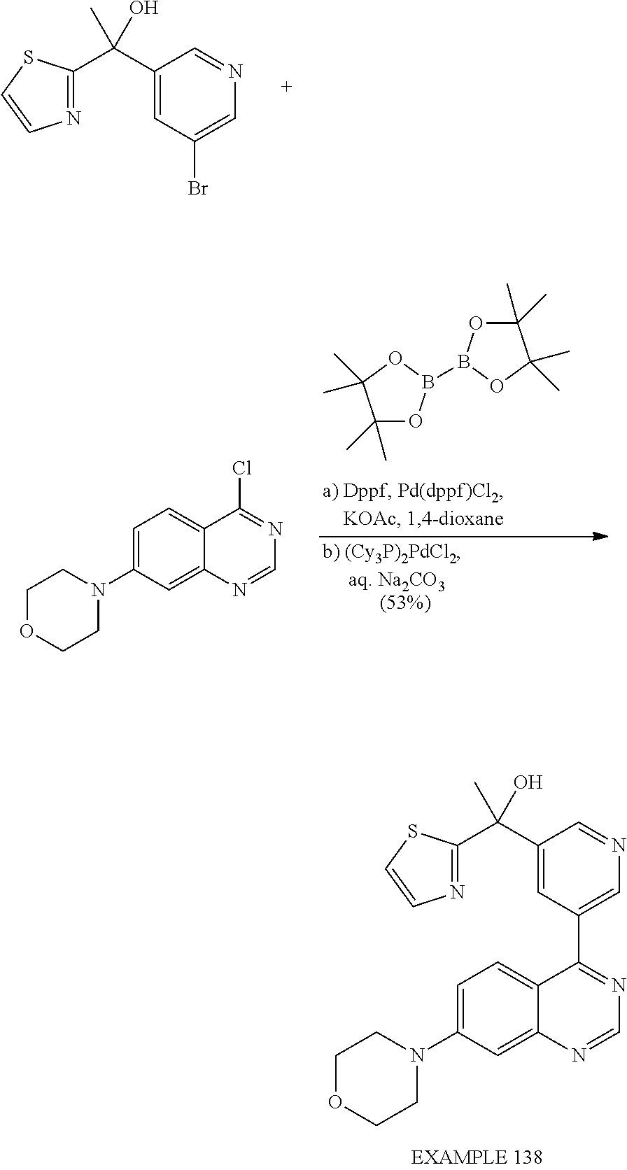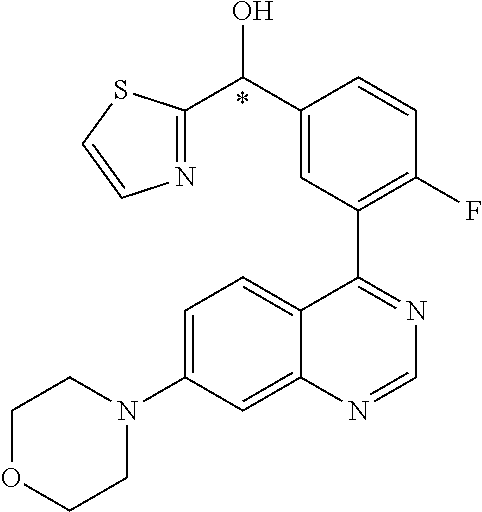 - PCPCDRDQIBENHU-XMMPIXPASA-N (r)-[4-fluoro-3-(7-morpholin-4-ylquinazolin-4-yl)phenyl]-(3-methylpyrazin-2-yl)methanol Chemical compound CC1=NC=CN=C1[C@H](O)C1=CC=C(F)C(C=2C3=CC=C(C=C3N=CN=2)N2CCOCC2)=C1 PCPCDRDQIBENHU-XMMPIXPASA-N 0.000 claims description 3
