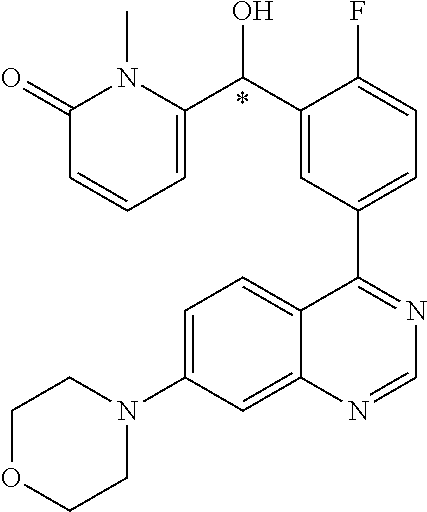 - IVAQITIIINVXDO-UHFFFAOYSA-N 6-[[4-fluoro-3-(7-morpholin-4-ylquinazolin-4-yl)phenyl]-hydroxymethyl]-1-methylpyridin-2-one Chemical compound C1=CC(=O)N(C)C(C(O)C=2C=C(C(F)=CC=2)C=2C3=CC=C(C=C3N=CN=2)N2CCOCC2)=C1 IVAQITIIINVXDO-UHFFFAOYSA-N 0.000 claims description 7