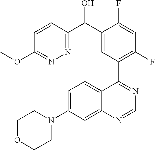 - ZBDQMZHCGWDHNL-UHFFFAOYSA-N [4-fluoro-3-(7-morpholin-4-ylquinazolin-4-yl)phenyl]-(5-methoxypyridazin-3-yl)methanol Chemical compound COC1=CN=NC(C(O)C=2C=C(C(F)=CC=2)C=2C3=CC=C(C=C3N=CN=2)N2CCOCC2)=C1 ZBDQMZHCGWDHNL-UHFFFAOYSA-N 0.000 claims description 4