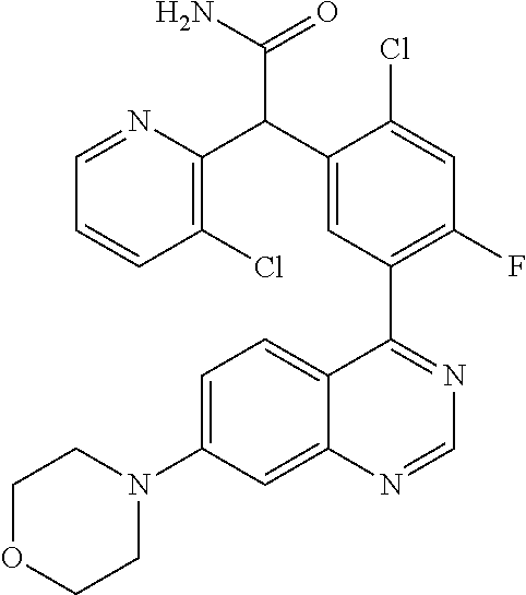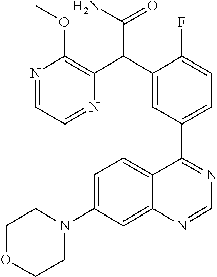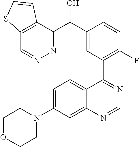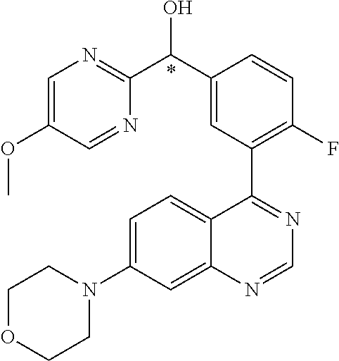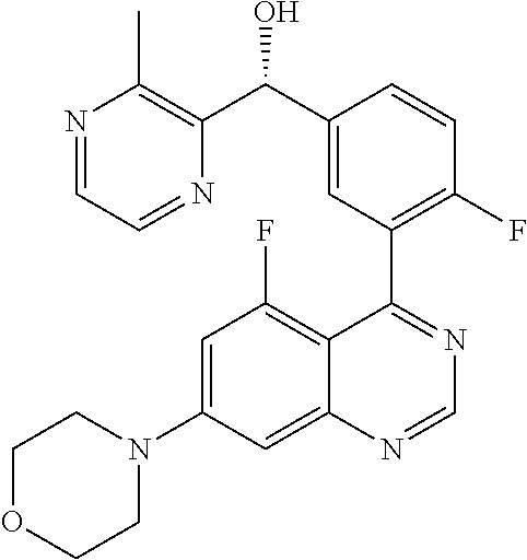 - QHNQVNYRYQEKGM-UHFFFAOYSA-N [4-fluoro-3-(7-morpholin-4-ylquinazolin-4-yl)phenyl]-(3-methoxypyrazin-2-yl)methanol Chemical compound COC1=NC=CN=C1C(O)C1=CC=C(F)C(C=2C3=CC=C(C=C3N=CN=2)N2CCOCC2)=C1 QHNQVNYRYQEKGM-UHFFFAOYSA-N 0.000 claims description 7