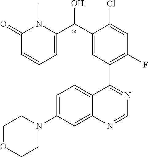 - WYNSFINJUTXESJ-UHFFFAOYSA-N 6-[[2-chloro-4-fluoro-5-(7-morpholin-4-ylquinazolin-4-yl)phenyl]-hydroxymethyl]-1-methylpyridin-2-one Chemical compound ClC1=C(C=C(C(=C1)F)C1=NC=NC2=CC(=CC=C12)N1CCOCC1)C(C1=CC=CC(N1C)=O)O WYNSFINJUTXESJ-UHFFFAOYSA-N 0.000 claims description 7