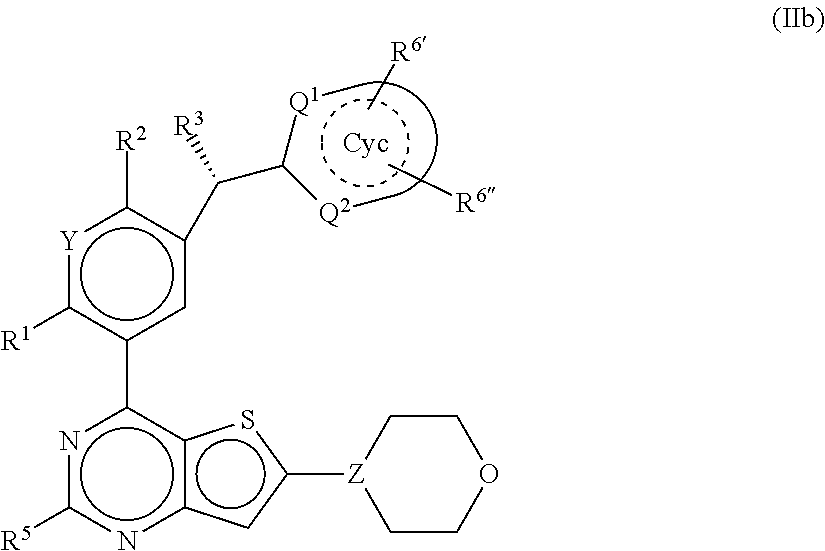 - IZJZSFQNGRBZAU-UHFFFAOYSA-N [2-chloro-4-fluoro-5-(6-morpholin-4-ylthieno[3,2-d]pyrimidin-4-yl)phenyl]-(3-methylpyrazin-2-yl)methanol Chemical compound CC1=C(N=CC=N1)C(O)C1=CC(=C(F)C=C1Cl)C1=NC=NC2=C1SC(=C2)N1CCOCC1 IZJZSFQNGRBZAU-UHFFFAOYSA-N 0.000 claims description 2