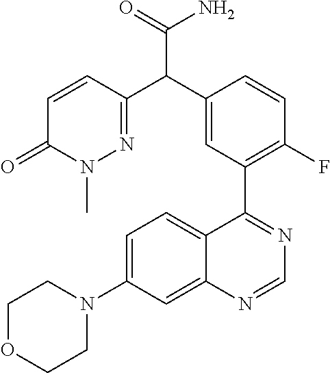 - LILWOSWCHKKJRS-UHFFFAOYSA-N 3-[[4-fluoro-3-(7-morpholin-4-ylquinazolin-4-yl)phenyl]-hydroxymethyl]-1H-pyridazin-6-one Chemical compound OC(c1ccc(F)c(c1)-c1ncnc2cc(ccc12)N1CCOCC1)c1ccc(=O)[nH]n1 LILWOSWCHKKJRS-UHFFFAOYSA-N 0.000 claims description 5