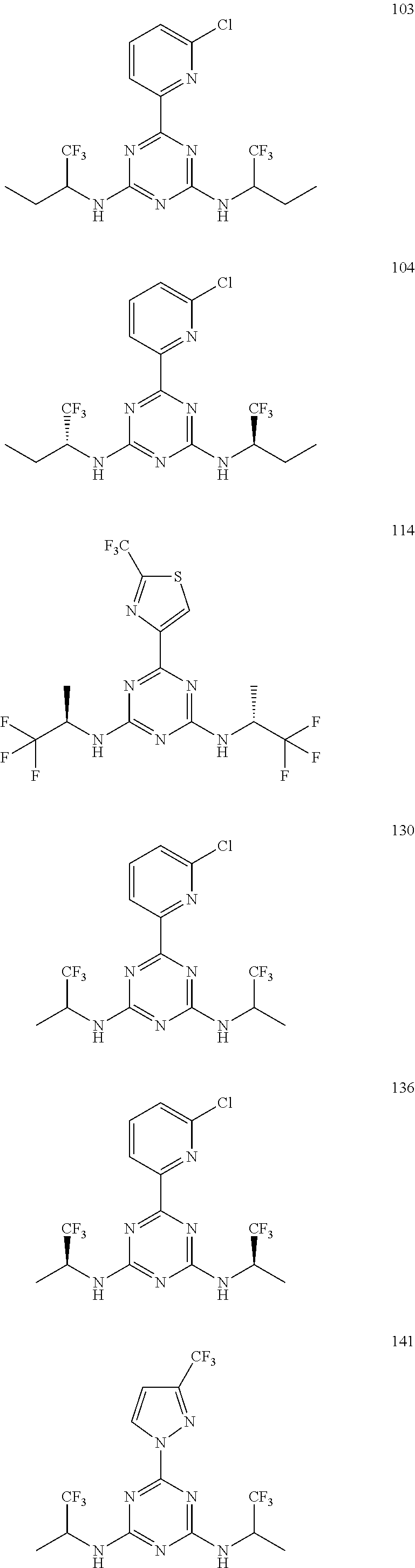 - (25) 2-chloro-4-(methylsulfonyl)-N-[4-[(phenylmethyl)amino]-6-(2-pyridinyl)-1,3,5-triazin-2-yl]-benzamide;