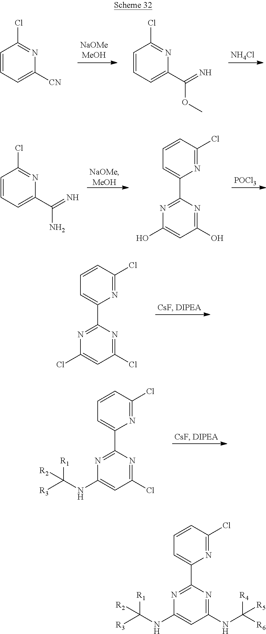 Step 3: Preparation of 2-(6-chloropyridin-2-yl)pyrimidine-4,6-diol. To a solution of sodium metal (0.9 g, 40 mmol) in MeOH (10 mL) was added 6-chloropicolinimid-amide (2 g, 13 mmol) and dimethyl malonate (1.7 g, 13 mmol). The reaction mixture was stirred at 85° C. overnight, and then concentrated under reduced pressure. The residue was triturated with EtOAc (30 mL) and filtered. The solid was collected and dried under high vacuum to give the desired product. LC-MS: m/z 224 (M+H)+.