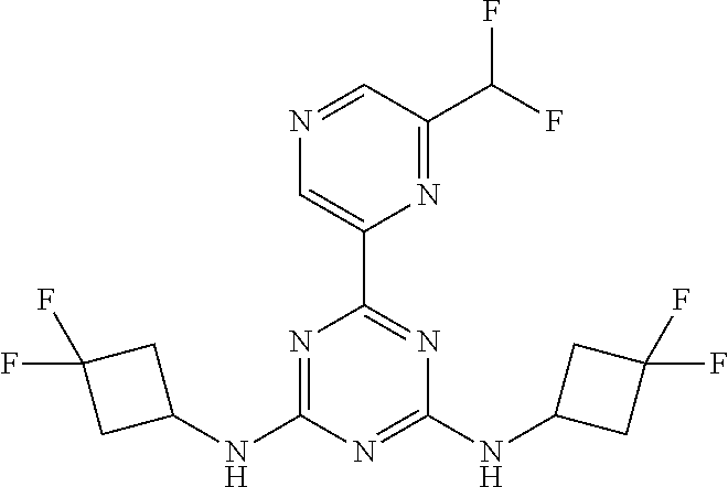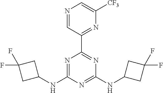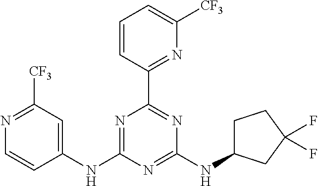 Step 6: Preparation of N2-(3,3-difluorocyclobutyl)-N4-(2-(trifluoromethyl)pyridin-4-yl)-6-(4-(trifluoromethyl)thiazol-2-yl)-1,3,5-triazine-2,4-diamine. To a solution of 2-(4-(3,3-difluorocyclobutylamino)-6-(2-(trifluoromethyl)pyridin-4-ylamino)-1,3,5-triazin-2-yl)-4-(trifluoromethyl)-4,5-dihydrothiazol-4-ol (250 mg, 0.48 mmol) and TEA (0.4 mL, 2.4 mmol) in DCM (20 mL) at 0° C. was added dropwise a solution of triphosgene (290 mg, 0.96 mmol) in DCM (5 mL). The reaction mixture was stirred at 0° C. for 0.5 hr, and then partitioned between DCM (20 mL) and H2O (10 mL). The organic layer was separated, washed with brine, dried over anhydrous Na2SO4, and concentrated and purified by standard methods to afford the desired product. 1H NMR (400 MHz, DMSO-d6) δ 11.05-10.94 (m, 1H), 9.10 (d, J=6.1 Hz, 1H), 8.82 (s, 1H), 8.70 (s, 1H), 8.64 (t, J=5.4 Hz, 1H), 7.83 (d, J=5.4 Hz, 1H), 4.52-4.22 (m, 1H), 3.18-2.99 (m, 2H), 2.82 (dt, J=32.2, 14.2 Hz, 2H). LC-MS: m/z 498 (M+H)+.