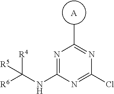 - (i) when X is N and A is optionally substituted phenyl, then (a) neither N(R7)C(R4)(R5)(R6) nor N(R8)C(R1)(R2)(R3) is NHCH2CH2OCH2CH2OCH2CH2NH2, 4-[[2-[2-(2-aminoethoxy)ethoxy]ethyl]amino] and (b) N(R7)C(R4)(R5)(R6) and N(R8)C(R1)(R2)(R3) are not both NHEt, NH(n-propyl), NH(n-butyl), NH(n-docecyl), NH-[(4-methoxyphenyl)methyl], NHCH2CH2CHO, NHCH2CH2OCH3, NHCH2CH2OH, NHCH2CH(OH)CH3, NHCH2CH2OC(O)phenyl, NHCH2CH2CH2OH, NHCH2CH2CH2N(CH3)phenyl, NHCH2C(O)OCH3, NHCH2C(O)OCH2CH3, NHCH2phenyl, NHCH(CH3)CH2CH3, or NHCH2CH2OC(O)CH3;