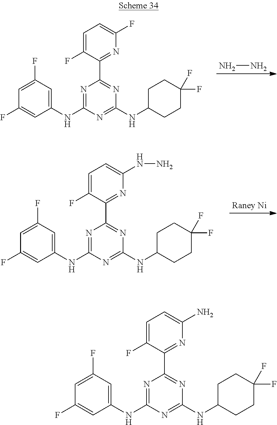 Step 4: Preparation of 4-(3,3-difluorocyclobutylamino)-6-(2-(trifluoromethyl)pyridin-4-ylamino)-1,3,5-triazine-2-carbothioamide. To a solution of 4-(3,3-difluorocyclobutylamino)-6-(2-(trifluoromethyl)pyridin-4-ylamino)-1,3,5-triazine-2-carbonitrile (0.7 g, 1.88 mmol) in DMF (15 mL) were added NaHS (0.5 g, 9.0 mmol) and MgCl2 (0.85 g, 9.0 mmol). The reaction mixture was stirred at r.t. for 0.5 hr then partitioned between EtOAc (30 mL) and H2O (10 mL). The organic layer was separated, washed with brine, dried over anhydrous Na2SO4, and concentrated and purified by standard methods to afford the desired product. LC-MS: m/z 406 (M+H)+.