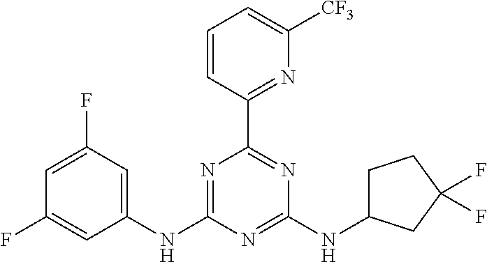 Step 3: Preparation of 4-(3,3-difluorocyclobutylamino)-6-(2-(trifluoromethyl)pyridin-4-ylamino)-1,3,5-triazine-2-carbonitrile. To a solution of 6-chloro-N2-(3,3-difluorocyclobutyl)-N4-(2-(trifluoromethyl)pyridin-4-yl)-1,3,5-triazine-2,4-diamine (2.2 g, 5.77 mmol) in MeCN (30 mL) and DMSO (10 mL) at r.t. was added NaCN (2.9 g, 60 mmol). The reaction mixture was stirred at 60° C. overnight then partitioned between EtOAc (50 mL) and H2O (20 mL). The organic layer was separated, washed with brine, dried over anhydrous Na2SO4, concentrated and purified by standard methods to afford the desired product. LC-MS: m/z 372 (M+H)+.