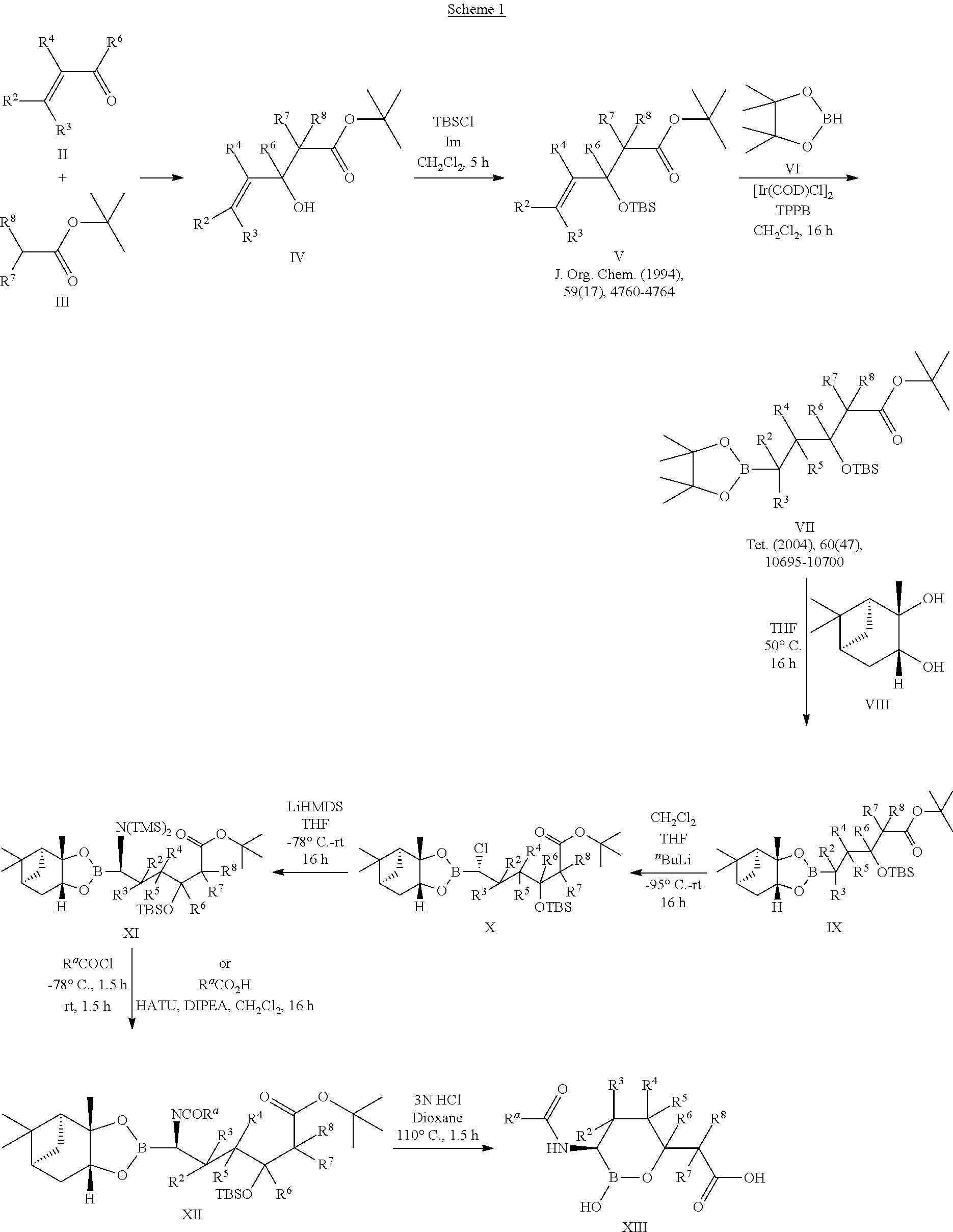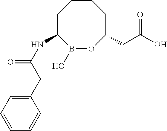 The increase of class D β-lactamase-expressing bacterium strains such as Acinetobacter baumannii has become an emerging multidrug-resistant threat. A. baumannii strains express A, C, and D class β-lactamases. The class D β-lactamases such as the OXA families are particularly effective at destroying carbapenem type β-lactam antibiotics, e.g., imipenem, the active carbapenems component of Merck's Primaxin® (Montefour, K.; et al. Crit. Care Nurse 2008, 28, 15; Perez, F. et al. Expert Rev. Anti Infect. Ther. 2008, 6, 269; Bou, G.; Martinez-Beltran, J. Antimicrob. Agents Chemother. 2000, 40, 428. 2006, 50, 2280; Bou, G. et al, J. Antimicrob. Agents Chemother. 2000, 44, 1556). This has imposed a pressing threat to the effective use of drugs in that category to treat and prevent bacterial infections. Indeed the number of catalogued serine-based β-lactamases has exploded from less than ten in the 1970s to over 300 variants. These issues fostered the development of five “generations” of cephalosporins. When initially released into clinical practice, extended-spectrum cephalosporins resisted hydrolysis by the prevalent class A β-lactamases, TEM-1 and SHV-1. However, the development of resistant strains by the evolution of single amino acid substitutions in TEM-1 and SHV-1 resulted in the emergence of the extended-spectrum β-lactamase (ESBL) phenotype.