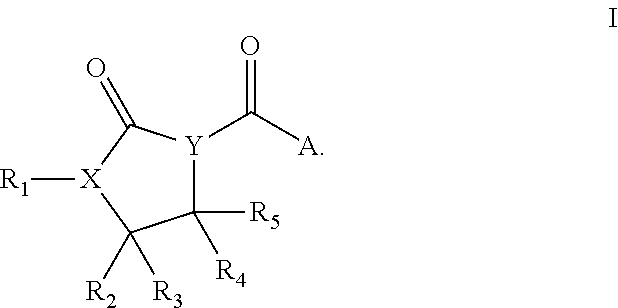 A is selected from the group consisting of R12, OR6, NR7R8 and CR9R10R11; R1, R2, R3, R4, R5, R6, R7, R8, R9, R10, R11 are independently selected from the group consisting of —H, ═O, ═NOR′, halogen, halogenated group, polyhalogenated group, —(CH2)nCN, —(CH2)nNO2, —(CH2)nR′, —(CH2)nCOOR′, —(CH2)nCONR′2, —(CH2)nOR′, —(CH2)nSR′, —(CH2)nSOR′, —(CH2)nSO2R′, —(CH2)nNR′2, —(CH2)nNR′COR′ and —(CH2)nNR′SO2R′;