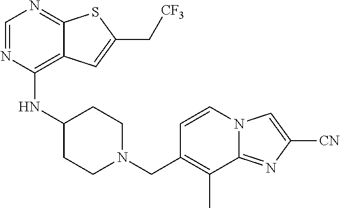 - PNBKKDYOUDWWJD-UHFFFAOYSA-N CC1=C2C=C(C#N)N(CC3=CNN=C3)C2=CC=C1CN1CCC(NC2=C3C=C(CC(F)(F)F)SC3=NC(N)=C2)CC1 Chemical compound CC1=C2C=C(C#N)N(CC3=CNN=C3)C2=CC=C1CN1CCC(NC2=C3C=C(CC(F)(F)F)SC3=NC(N)=C2)CC1 PNBKKDYOUDWWJD-UHFFFAOYSA-N 0.000 description 2