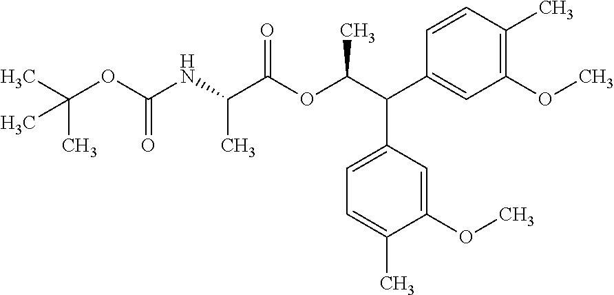 - YQOKKTIQWONZJM-MLCCFXAWSA-N CC(C(c(cccc1F)c1OC)c1cccc(F)c1OC)OC([C@H](C)NC(OC(C)(C)C)=O)=O Chemical compound CC(C(c(cccc1F)c1OC)c1cccc(F)c1OC)OC([C@H](C)NC(OC(C)(C)C)=O)=O YQOKKTIQWONZJM-MLCCFXAWSA-N 0.000 description 1