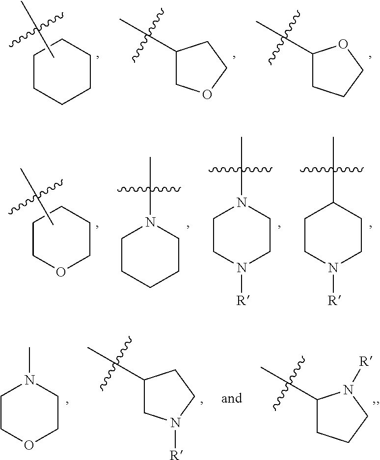 - each of moieties R4, R5, R6, R7, R8, R9, R10, and R11 are independently selected for each occurrence from the group consisting of hydrogen, C1-6alkyl, C2-6alkenyl, C2-6alkynyl, halogen, hydroxyl, nitro, cyano, NR′R″, —C(O)—NR′R″, —S(O)w—C1-6alkyl (where w is 1, 2 or 3), —NR′—S(O)w, and —S(O)w—NR′R″ (where w is 0, 1 or 2), C1-6alkoxy, —C(O)—OH, —C(O)—C1-6alkyl, and —C(O)—C1-6alkoxy;