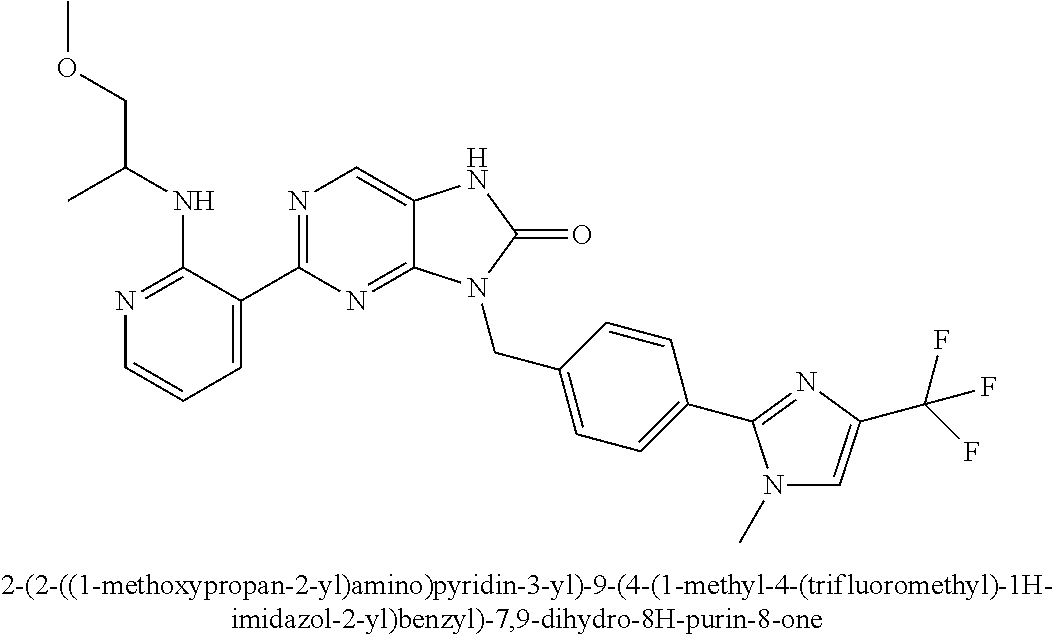2-(2-(1-Hydroxycyclopropyl)phenyl)-9-(4-(1-methyl-4-(trifluoromethyl)-1H-imidazol-2-yl)benzyl)-7,9-dihydro-8H-purin-8-one (I-526) and 9-(4-(1-methyl-4-(trifluoromethyl)-1H-imidazol-2-yl)benzyl)-2-(2-propionylphenyl)-7,9-dihydro-8H-purin-8-one (I-527)
