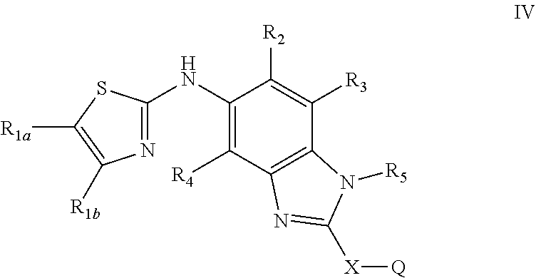 - DYVDVXVZVQDJDE-UHFFFAOYSA-N n-[6-methyl-2-(3-methylphenyl)-1h-benzimidazol-5-yl]-4-pyridin-4-yl-1,3-thiazol-2-amine Chemical compound CC1=CC=CC(C=2NC3=CC(C)=C(NC=4SC=C(N=4)C=4C=CN=CC=4)C=C3N=2)=C1 DYVDVXVZVQDJDE-UHFFFAOYSA-N 0.000 claims description 5