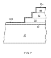 During manufacture the second dielectric 304 may be deposited over the stack of the first dielectric by chemical vapor phase deposition. Consequently, the layer 304 initially covers the entire upper surface of the device as shown in FIG. 7, and is then etched back by patterning and selective etching. This allows the spatial extent of this layer to be relatively easily defined. Thus the device shown in FIG. 5 can be fabricated.