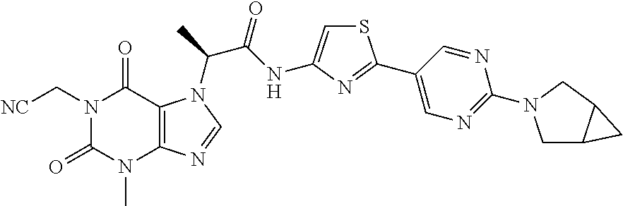 To a solution of 2-(6-(3-azabicyclo[3.1.0]hexan-3-yl)pyridin-3-yl)thiazol-4-amine (70 mg, 0.238 mmol) in dry DCM (3 mL) was added drop-wise trimethylaluminum (1.1 mL, 1.084 mmol) at 0° C. After the addition, the mixture was warmed to RT and stirred for 0.5 h. Then a solution of (S)-methyl 2-(1-(but-2-yn-1-yl)-3-methyl-2,6-dioxo-2,3-dihydro-1H-purin-7(6H)-yl)propanoate (82 mg, 0.271 mmol) in dry DCM (0.5 mL) was added drop-wise and the reaction mixture was stirred at RT overnight. The reaction was quenched by addition of several drops of MeOH. The mixture was concentrated under reduced pressure and the residue was purified by chromatography (DCM:MeOH=80:1) to afford a crude product, which was further purified via preparative HPLC to afford (2S)—N-(2-(6-(3-azabicyclo[3.1.0]hexan-3-yl)pyridin-3-yl)thiazol-4-yl)-2-(1-(but-2-yn-1-yl)-3-methyl-2,6-dioxo-2,3-dihydro-1H-purin-7(6H)-yl)propanamide (3.3 mg, 2% yield) as a pale yellow solid. Retention time (LC-MS): 1.273 min. MH+ 531. 1H NMR (400 MHz, DMSO-d6) δ 11.58 (s, 1H), 8.62 (s, 1H), 8.36 (s, 1H), 7.94-7.91 (m, 1H), 7.40 (s, 1H), 6.56 (d, J=8.8 Hz, 1H), 5.75-5.73 (m, 1H), 4.53-4.51 (m, 2H), 3.70 (d, J=10.8 Hz, 2H), 3.45 (d, J=10.0 Hz, 5H), 1.84 (d, J=7.2 Hz, 3H), 1.72-1.70 (m, 5H), 0.78-0.76 (m, 1H), 0.20-0.17 (m, 1H).