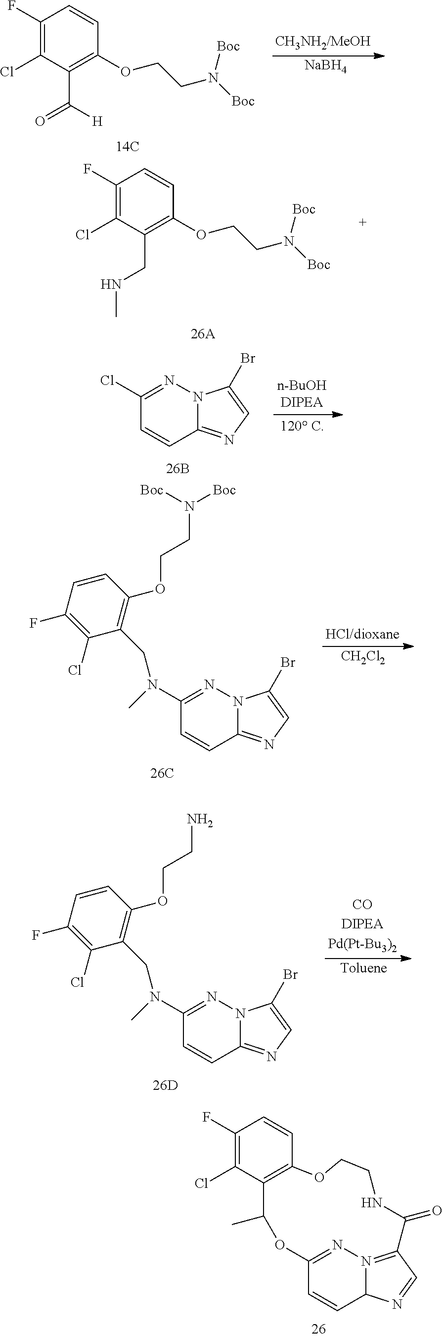 Crizotinib (PF-02341066) is a tyrosine kinase drug targeting MET/ALK/ROS1/RON with moderate activity against TRKs and AXL. Cui, J. J. et al., J. Med. Chem. 2011, 54, 6342-6363. It was approved to treat certain patients with late-stage (locally advanced or metastatic) NSCLC that expresses the abnormal ALK fusion gene identified by a companion diagnostic test (Vysis ALK Break Apart FISH Probe Kit). Similar to imatinib and other kinase inhibitor drugs, resistance invariably develops after a certain time of treatment with crizotinib. The resistance mechanisms include ALK gene amplification, secondary ALK mutations, and aberrant activation of other kinases including KIT and EGFR. Katayama, R. et al., Sci. Transl. Med. 2012, 4, 120ra17. Based on the clinical success of second generation ABL inhibitors for the treatment of imatinib resistance in CML patients, a second generation of ALK inhibitors is emerging. These drugs target the treatment of crizotinib-refractory or resistant NSCLC patient with more potent inhibition against both wild and mutant ALK proteins. Gridelli, C. et al., Cancer Treat Rev. 2014, 40, 300-306.