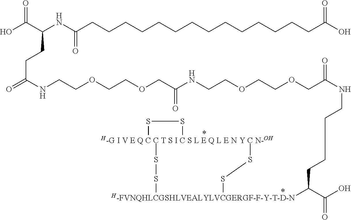 - PBGKTOXHQIOBKM-FHFVDXKLSA-N insulin (human) Chemical compound C([C@@H](C(=O)N[C@@H](CC(C)C)C(=O)N[C@H]1CSSC[C@H]2C(=O)N[C@H](C(=O)N[C@@H](CO)C(=O)N[C@H](C(=O)N[C@H](C(N[C@@H](CO)C(=O)N[C@@H](CC(C)C)C(=O)N[C@@H](CC=3C=CC(O)=CC=3)C(=O)N[C@@H](CCC(N)=O)C(=O)N[C@@H](CC(C)C)C(=O)N[C@@H](CCC(O)=O)C(=O)N[C@@H](CC(N)=O)C(=O)N[C@@H](CC=3C=CC(O)=CC=3)C(=O)N[C@@H](CSSC[C@H](NC(=O)[C@H](C(C)C)NC(=O)[C@H](CC(C)C)NC(=O)[C@H](CC=3C=CC(O)=CC=3)NC(=O)[C@H](CC(C)C)NC(=O)[C@H](C)NC(=O)[C@H](CCC(O)=O)NC(=O)[C@H](C(C)C)NC(=O)[C@H](CC(C)C)NC(=O)[C@H](CC=3NC=NC=3)NC(=O)[C@H](CO)NC(=O)CNC1=O)C(=O)NCC(=O)N[C@@H](CCC(O)=O)C(=O)N[C@@H](CCCNC(N)=N)C(=O)NCC(=O)N[C@@H](CC=1C=CC=CC=1)C(=O)N[C@@H](CC=1C=CC=CC=1)C(=O)N[C@@H](CC=1C=CC(O)=CC=1)C(=O)N[C@@H]([C@@H](C)O)C(=O)N1[C@@H](CCC1)C(=O)N[C@@H](CCCCN)C(=O)N[C@@H]([C@@H](C)O)C(O)=O)C(=O)N[C@@H](CC(N)=O)C(O)=O)=O)CSSC[C@@H](C(N2)=O)NC(=O)[C@H](CCC(N)=O)NC(=O)[C@H](CCC(O)=O)NC(=O)[C@H](C(C)C)NC(=O)[C@@H](NC(=O)CN)[C@@H](C)CC)[C@@H](C)CC)[C@@H](C)O)NC(=O)[C@H](CCC(N)=O)NC(=O)[C@H](CC(N)=O)NC(=O)[C@@H](NC(=O)[C@@H](N)CC=1C=CC=CC=1)C(C)C)C1=CN=CN1 PBGKTOXHQIOBKM-FHFVDXKLSA-N 0.000 claims description 408
