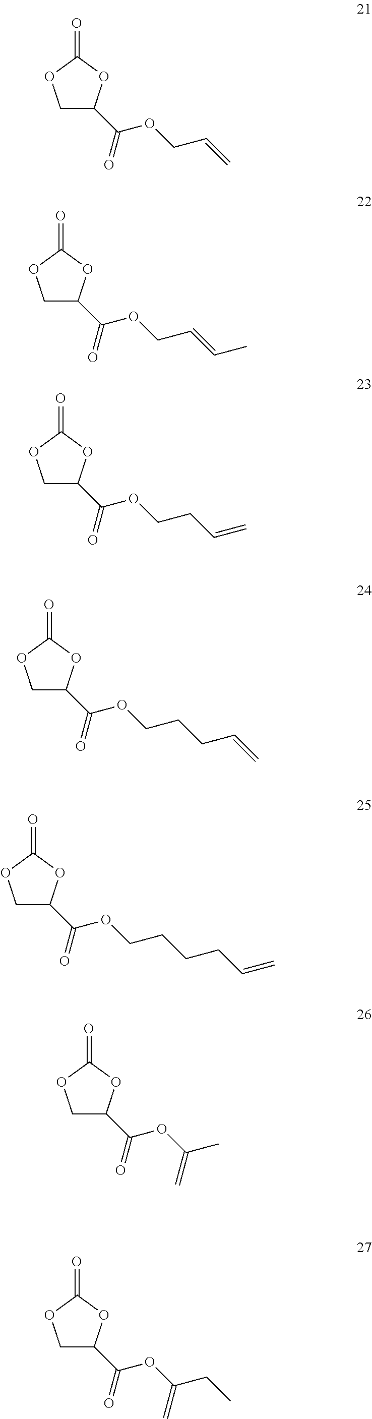 Among the aforementioned compounds, as the compound represented by the general formula (I-1), the compounds having any one of the structural formulae of 1 to 4, 6, 7, 12 to 15, 19 to 23, 26, 27, 29 to 31, 33, 34, 41, 42, 46 to 49, 81, 82, 84, 85, 88, 89, 112, 115 to 131, 133 to 136, 138, 140 to 143, 146, 147, and 148 are more preferred; the compounds having any one of the structural formulae of 19 to 21, 26, 29, 30, 33, 46, 47, 81, 82, 84, 85, 88, 115 to 118, 123, 124, and 140 to 143 are still more preferred; and 2-propenyl 2-oxo-1,3-dioxolane-4-carboxylate (structural formula 21), 2-propynyl 2-oxo-1,3-dioxolane-4-carboxylate (structural formula 29), 2-propynyl 5-fluoro-2-oxo-1,3-dioxolane-4-carboxylate (structural formula 116), 2-propynyl 4-fluoro-2-oxo-1,3-dioxolane-4-carboxylate (structural formula 118), di(2-propenyl) 2-oxo-1,3-dioxolane-4,5-dicarboxylate (structural formula 123), di(2-propynyl) 2-oxo-1,3-dioxolane-4,5-dicarboxylate (structural formula 124), 2-butene-1,4-diyl bis(2-oxo-1,3-dioxolane-4-carboxylate) (structural formula 140), and 2-butyne-1,4-bis(2-oxo-1,3-dioxolane-4-carboxylate) (structural formula 142) are especially preferred.