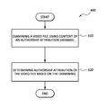 In one embodiment, examining at block 510 can include searching an authorship attribution database 610, the authorship attribution database 610 storing information of one or more authorship attribution video file.