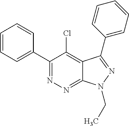 - DDEALTHLBQVQPI-UHFFFAOYSA-N CN1N=C(C2=CC=C(Cl)C=C2)C2=C(Cl)C(C3=CC=CC=C3)=NN=C21 Chemical compound CN1N=C(C2=CC=C(Cl)C=C2)C2=C(Cl)C(C3=CC=CC=C3)=NN=C21 DDEALTHLBQVQPI-UHFFFAOYSA-N 0.000 description 2