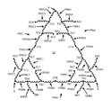 The lines are vector lines depicting the vector of the induced voltage. Two vector lines that are parallel to each other represent magnetic coupling between corresponding two windings. For example, line SA3-TA3 is parallel to line BC, which indicates that secondary winding SWA1 is magnetically coupled to primary PWB, line SC3-TC3 is parallel to line AB, which indicates that secondary winding SWC3 is magnetically coupled to primary PWA, and line TB1-SB1 is parallel to line CA, which indicates that secondary winding SWB1 is magnetically coupled to primary PWC. The radial length of each segment between two junctions along the circumference represents the phase angle difference between the output signals at those junctions, with the full circle representing 360 degrees. The common center of the circle represents the effective electrical neutral position.