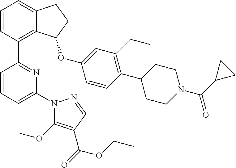 - (+)-(S)-1-(3-(3-(4-(1-(cyclopropanecarbonyl)piperidin-4-yl)-3-ethylphenoxy)-2,3-dihydro-1H-inden-4-yl)phenyl)-5-methoxy-1H-pyrazole-4-carboxylic acid;