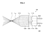 As described above, the optical signal passing through the optical transmission path 202A in the cable body 201 turns into the parallel light LA1 by the lens section 110A, and is output to the diffusion section 120A arranged on the front surface of the collimating lens 111A. The lens section 110A side of the diffusion section 120A is the concave surface 122A curved concavely, and the parallel light LA1 input from the collimating lens 111A is diffused by the curvature of the concave surface 122A, further passes through the convexly curved cylindrical convex surface 121A on the front surface of the diffusion section 120A, is collected by the curvature of the convex surface 121A as the light ray LA1 having a focal point C near the front of the convex surface 121A, and is diffused significantly from the focal point. The curvatures of the concave surface 122A and the convex surface 121A are adjusted such that safety standards are met by this diffusion.