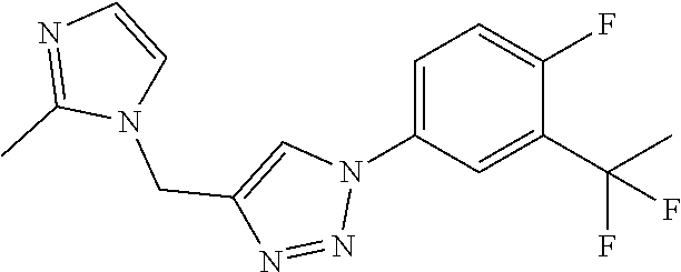 - QSKZBFJMOFMZSF-UHFFFAOYSA-N CC1=NC=CN1CC1=CN(N=N1)C1=CC(C(F)F)=C(F)C=C1 Chemical compound CC1=NC=CN1CC1=CN(N=N1)C1=CC(C(F)F)=C(F)C=C1 QSKZBFJMOFMZSF-UHFFFAOYSA-N 0.000 claims description 6